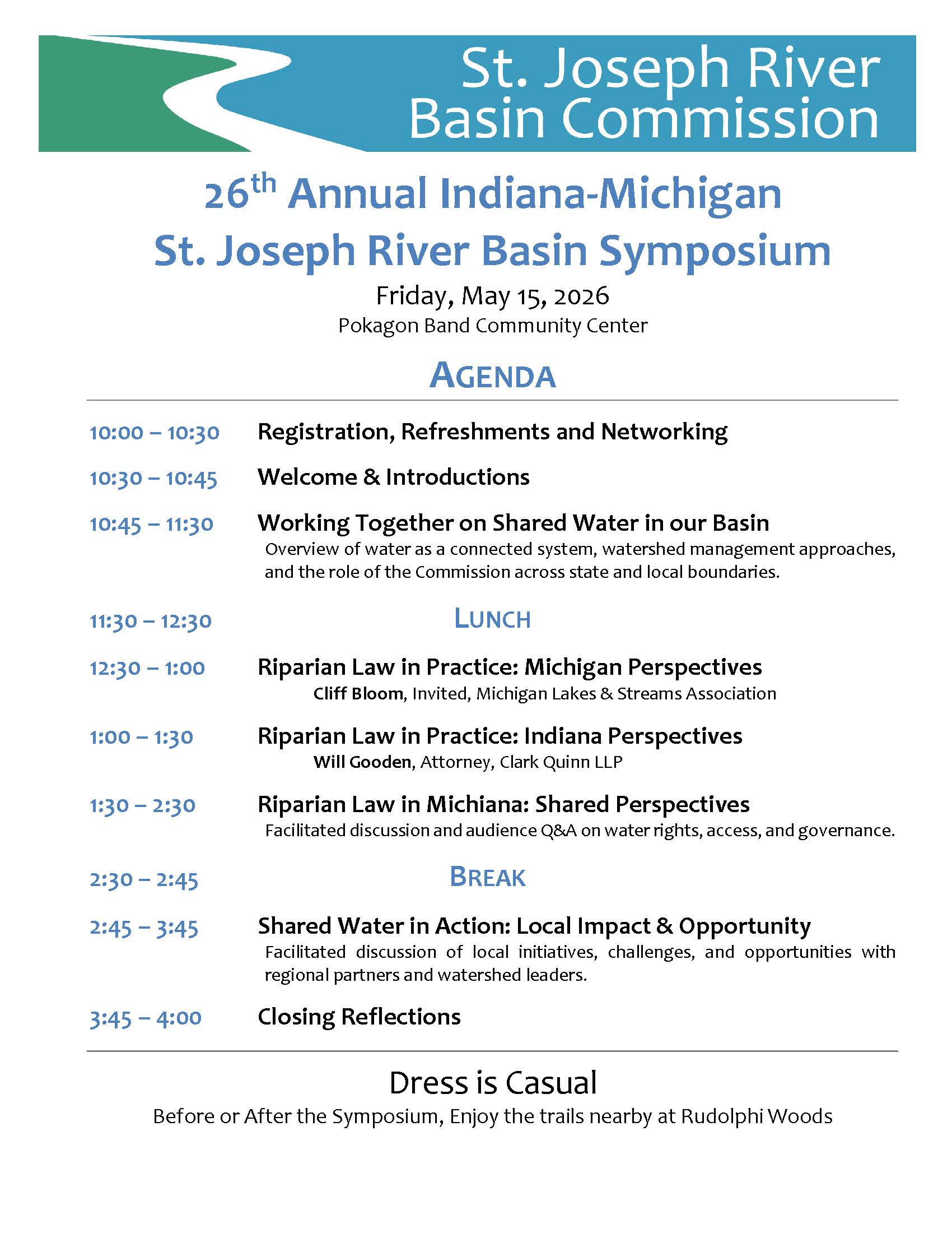 The 26th Annual Symposium will be held at the Pokagon Band Community Center in Dowagiac, Michigan. This year’s program focuses on how water is shared, governed, and managed across the St. Joseph River Basin.